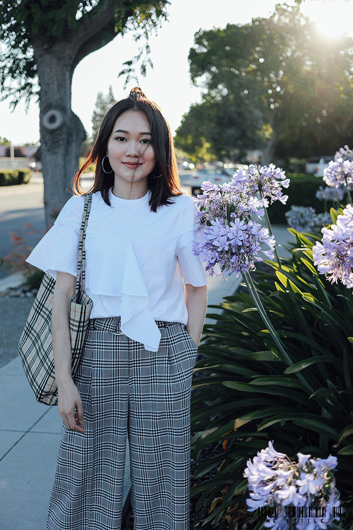 加上荷叶边元素的白T,更多了些乖巧温柔感。而同样有着荷叶边的袖子,是最好的遮蝴蝶臂利器。